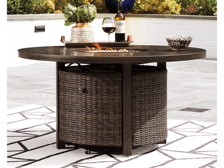 Turn your backyard space into your own piece of paradise with the Paradise Trail outdoor table with fire pit. Though this outdoor table looks remarkably like wood, it’s made of sturdy, rust-proof aluminum that’s perfectly suited for alfresco living. Enhancing the rustically refined aesthetic: side panels accented with all-weather, handwoven resin wicker. The result may look high maintenance, but rest assured, this outdoor fire pit table is anything but. With the press of a button, ignite a flickering flame that dances over a bed of glass beads. And with room for up to eight, it’s one highly accommodating outdoor bar table.