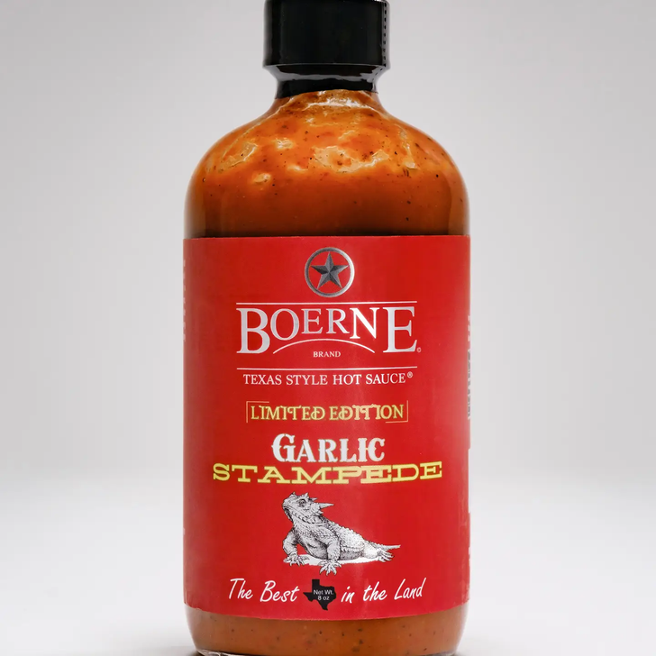 Garlic lovers, saddle up. Our Limited Edition Garlic Stampede garlic hot sauce charges in with a cayenne kick, a bold wave of garlic, and just enough tang to keep things interesting. Our garlic hot sauce is not subtle. It’s a full-flavored garlicky gallop of heat and savory spice, built from cayenne, black pepper, and a heavy garlic essence. Whether you’re drizzling it on pizza, wings, grilled meats, or mixing it into your next marinade, Boerne Brand garlic hot sauce brings the kind of flavor that doesn’t hang back. Big, bright, and impossible to ignore. Garlic Stampede isn’t just a hot sauce. It’s a full-on flavor takeover.
