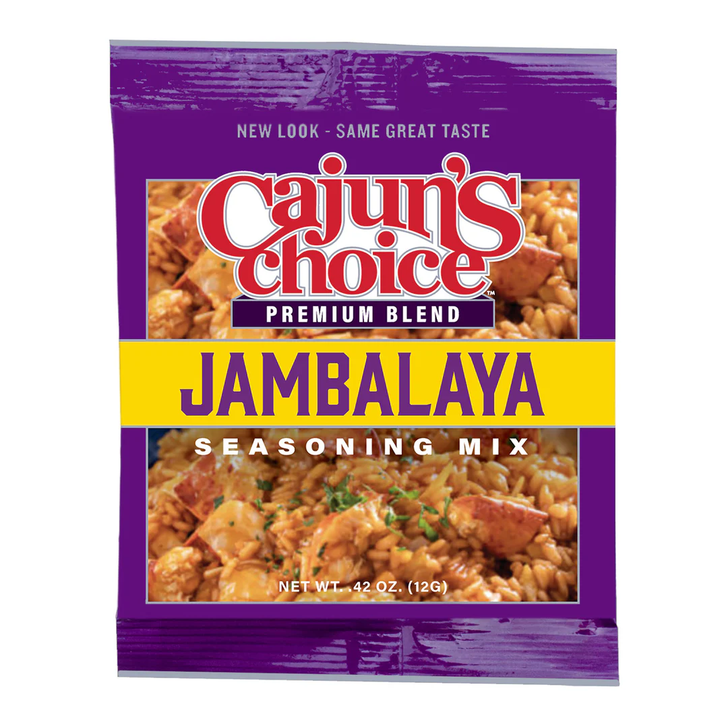 You’ll need: Cajun’s Choice Jambalaya Seasoning Mix, 1½ lbs boneless chicken cut into bite-sized pieces and/or medium uncooked, cleaned shrimp, 1 lb smoked sausage sliced (Kielbasa works great), 2 cups chopped onion, 1 cup chopped celery, 1 cup chopped bell pepper, 4 cups chicken broth, one 15 oz can diced tomatoes, and 2 cups uncooked long-grain rice.