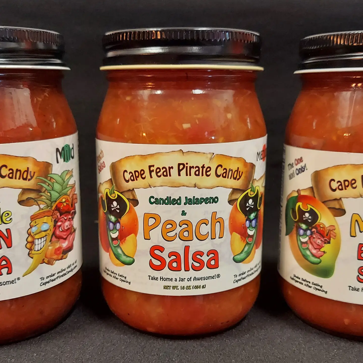 New Fruit Salsa Sampler 4 Pints of our New Candied Jalapeno & Peach Salsa, 4 Pints of Candied Jalapeno & Mango Bacon Salsa and 4 Pints of Honey Kissed Candied Banana Pepper & Pineapple Bacon Salsa. 24 Month Shelf Life. Cape Fear Pirate Candy – Take home a jar of awesome!®