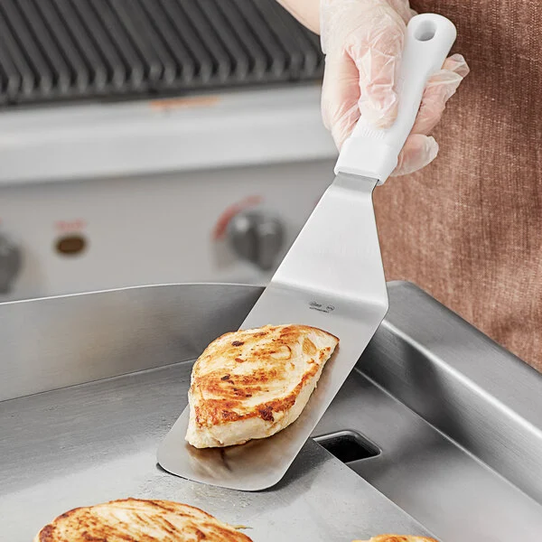 Featuring a large and durable stainless steel blade made for flipping a generous amount of food items at once, this turner is ideal for busy kitchens needing to flip food fast and consistently.