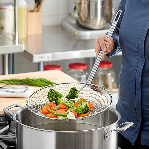 Crafted from steel with a nickel plating for added durability and rust resistance, this skimmer is designed to withstand the demands of a commercial kitchen. It's great for transferring blanched items from a pot of boiling water to an ice bath, or for putting items into, and lifting items out of, a frying pan. Plus, when it comes to cleanup, this skimmer is a breeze, offering quick and easy maintenance after use.