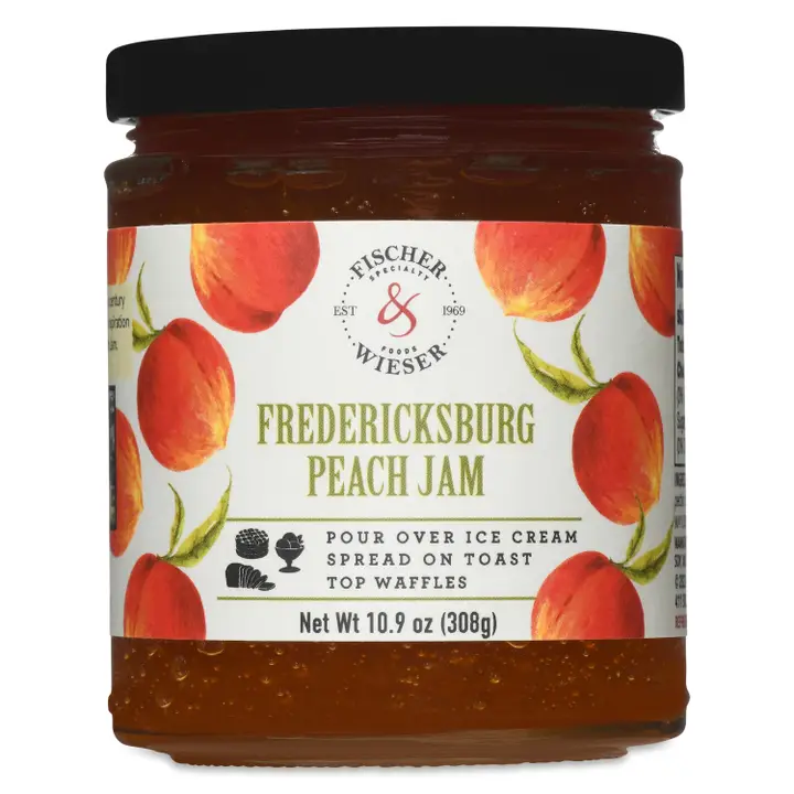 Spreading happiness from Fredericksburg, Texas, our Fredericksburg Peach Jam evokes memories of being in the Texas Hill Country even when you can't. This fruit-forward jam is full of bright, sweet peach flavor companioned by a little tart lemon that makes it the perfect addition to breakfast items, desserts or grilled meats.