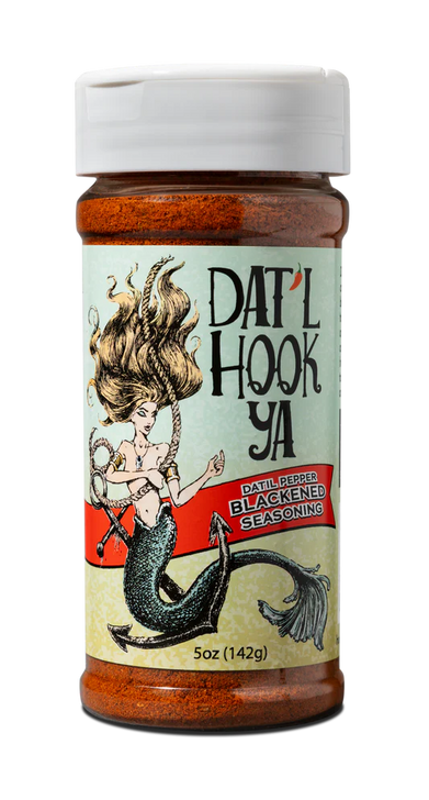 Dat'l Hook Ya Blackened Seasoning is by far the best seasoning you will put on your fresh catch, steaks, chicken and vegetables. Put it on top of your low country boil before you toss it and you will have something truly amazing! Have you looked at other brands and seen the anti-caking agents and MSG? Our seasoning is all natural, gluten free, vegan, MSG free, no preservatives, GMO-free. Due to being all natural, if it clumps up a little just give it a few shakes and enjoy! Sprinkle a little for flavor or layer a lot for that Datil Heat!!! Heat level is on the higher end of medium for that nice datil bite. You just got hooked again.