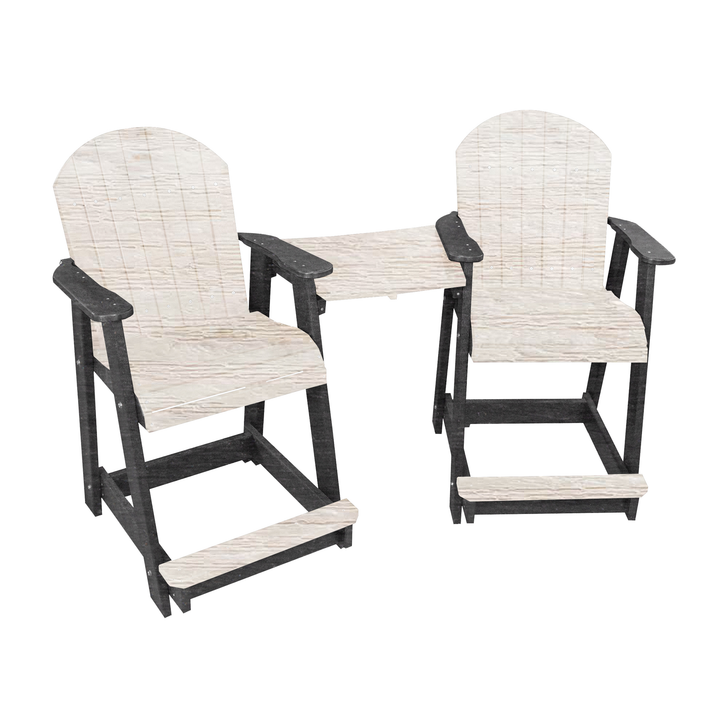This elevated two-seat design positions occupants at a comfortable bar height, encouraging conversation while maintaining a relaxed seating posture. A built-in center surface provides a convenient place for drinks, snacks, or small accessories, making it ideal for patios, decks, outdoor bars, and commercial gathering spaces.