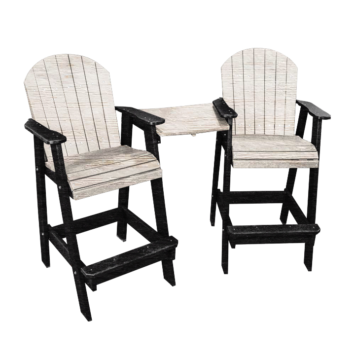 This elevated two-seat design positions occupants at a comfortable bar height, encouraging conversation while maintaining a relaxed seating posture. A built-in center surface provides a convenient place for drinks, snacks, or small accessories, making it ideal for patios, decks, outdoor bars, and commercial gathering spaces.