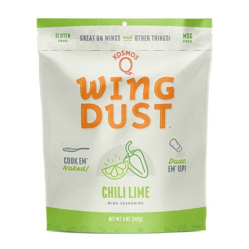 Introducing Kosmo's Q original Chili Lime Wing Dust, the perfect fiery addition to any homemade baked wings recipe! All you have to do is cook your wings, toss them in your favorite sauce, and then add the wing dust for an explosion of flavor that will change the way you see wings forever! Don't eat chicken wings very often? This unique blend of Kosmo spice, chili and lime will have your taste buds dancing a wonder tango in your mouth. INGREDIENT STATEMENT: Salt, Spices Including Chipotle and Paprika, Dehydrated Onion & Garlic, Sugar, Citric Acid, Natural Flavors Including Smoke, And Less Than 2% Soybean Oil & Silicon Dioxide Added To Prevent Caking.