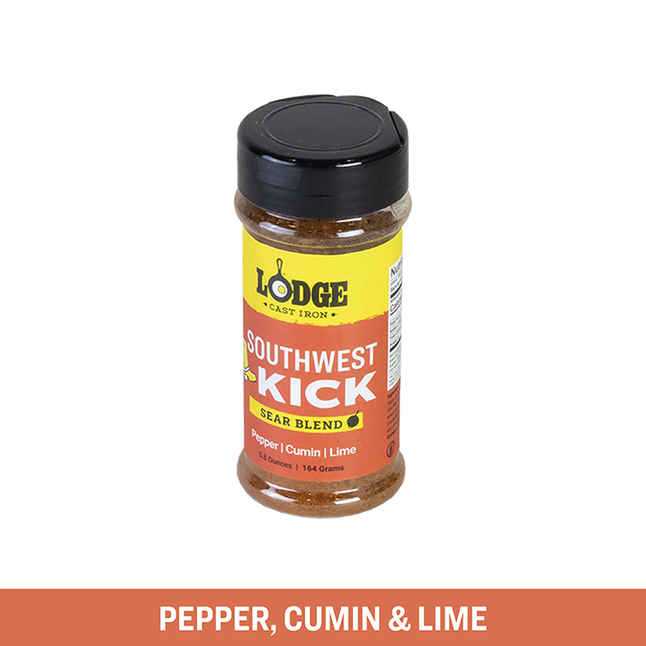 At Lodge, we have some pretty strong opinions about food. Our new Sear Blends bring over 125+ years of good eating (and heated debates) to the table, helping you pack big flavor into your favorite foods. Use them over the grill, stove, or even in the oven—all those places cast iron does its best work. Southwest Kick is a high-heat-loving blend inspired by cactus country, made for everything from pork chops and steaks to shrimp. Add a little kick to your favorite seared foods with a boot-scootin blend of pepper, cumin, and lime.