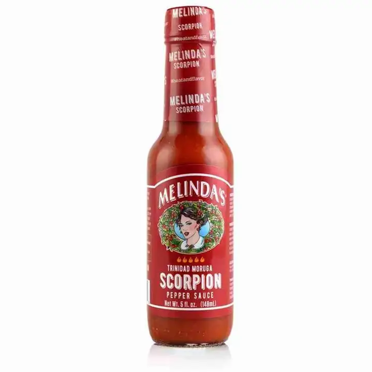 Melinda’s Scorpion. No training wheels here. This is our hottest sauce, made with the 2 million Scoville Trinidad Moruga Scorpion pepper. On a scale of 5, this is 11. Made the Melinda’s way with whole, fresh ingredients and the best peppers on the planet. Perfect for the most extreme Chileheads. Uses: A dash. Seriously, just a dash.