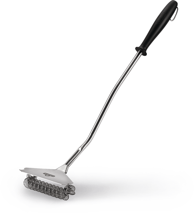 Keep your stainless steel cooking grids clean with this wide bristle free grill brush featuring an extra wide design and grid scraper. The curved handle design adds extra leverage when scrubbing and the built-in hook means your grill brush is always within reach.