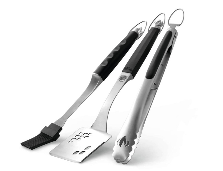 Easy to use locking tongs, a large and sturdy, multifunctional spatula and a long handled, silicone basting brush