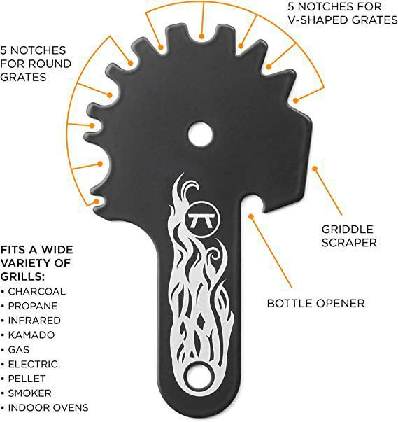 UNIVERSAL GRILL SCRAPER TOOL has 10 grooves that work with most grill grates; 5 grooves for v- shaped grates, 5 grooves for round grates, a flat side for griddles and a BONUS built-in bottle opener!