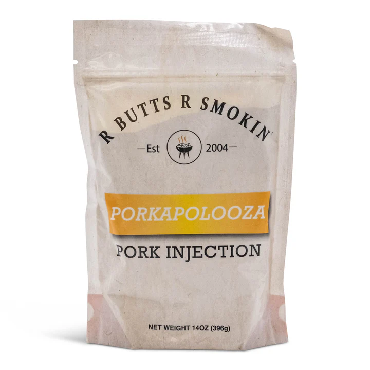 Unleash a symphony of incredible flavors with the award-winning Porkapalooza Pork Injection. Crafted with a hint of sweetness, this blend has earned top honors at the prestigious American Royal barbecue competition. Simply mix with water, inject into your pork, and prepare to experience a burst of mouthwatering taste and irresistible moisture. With each juicy bite, elevate your pork dishes to extraordinary heights. Discover the effortless path to peak flavor and succulence with R Butts R Smokin' Porkapalooza Pork Injection.