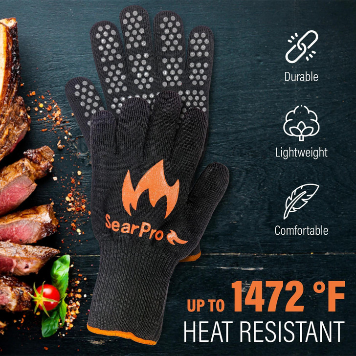 ► VARIETY OF USES: The SearPro grill gloves offer a comfortable solution to a range of tasks. Whether you are grilling, baking, lighting a fire, or using kitchen utensils, these gloves provide you with a safer experience. The silicone padded bottom allows for greater protection as well as a non-slip surface for handling objects.