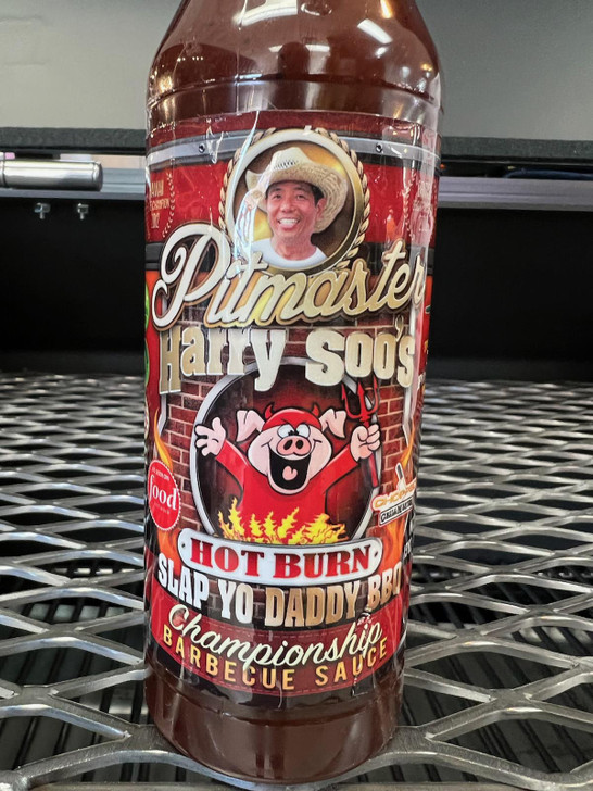 Slap Yo Daddy Hot Burn BBQ Sauce: A different and hot version of Harry's winning flavors with more tomato flavor, more kick, and a balanced tanginess. It's complex flavor is a four-phase taste experience. First you taste the flavor followed by the experience of the mild heat a few seconds later which makes your lips and tongue start to tingle, and then it all dissipates. Then you are ready to begin the cycle again. Baste on the last few minutes to form a glaze or pour on just before serving. It also makes a great dipping sauce!