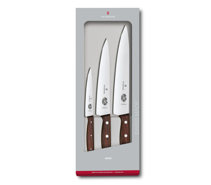 With our Wood Carving Set, 3 pieces, you will easily cut your way through all kinds of foods. Each of the three pieces has an elegant, robust wooden handle, whose uniquely patterned surface has been polished manually for a smooth and comfortable grip. The kitchen knife, with a blade length of 12 cm, is the tool to reach for when cutting small fruits and vegetables, and it is the ideal companion to the 19 cm and 22 cm carving knives. Both deliver smooth and uniform cuts to cooked and grilled meat, without affecting its fiber. What's more, the carving knives are also great for cutting larger fruits and vegetables such as melons or cabbages.